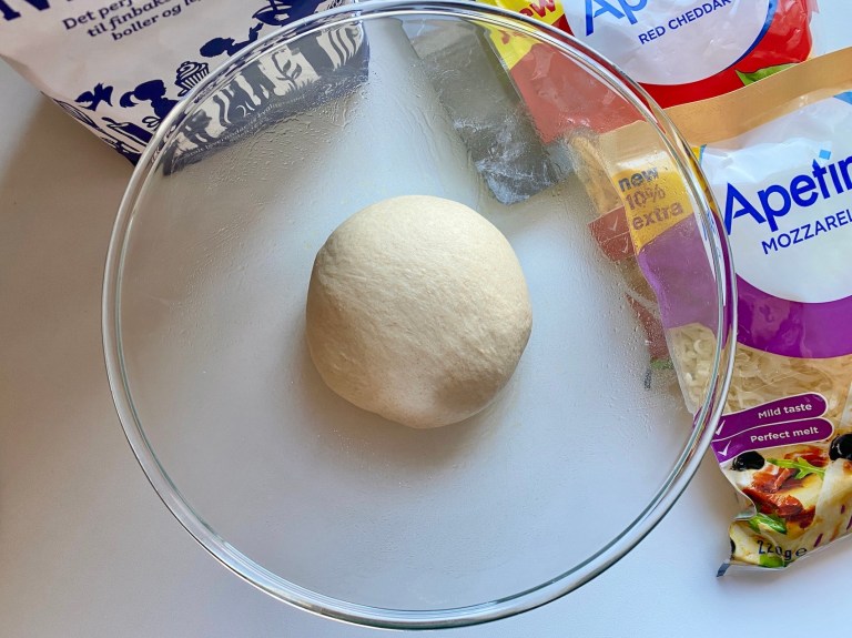 Dekk til med plastfolie og la den heve i 1 times tid, til dobbel størrelse.