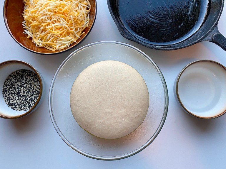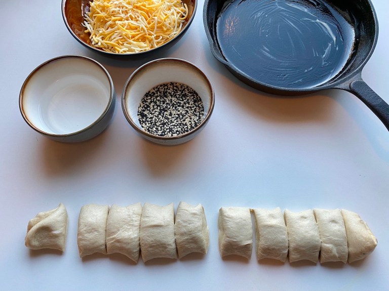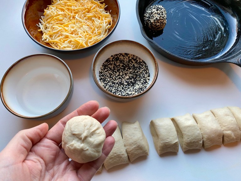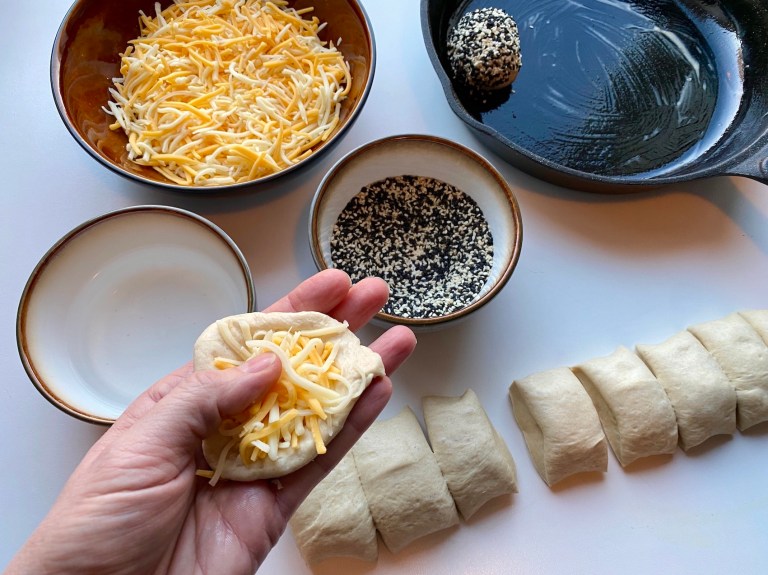 flate pizzabunner. Legg mozzarella/cheddar blanding ned i midten og lukk igjen.