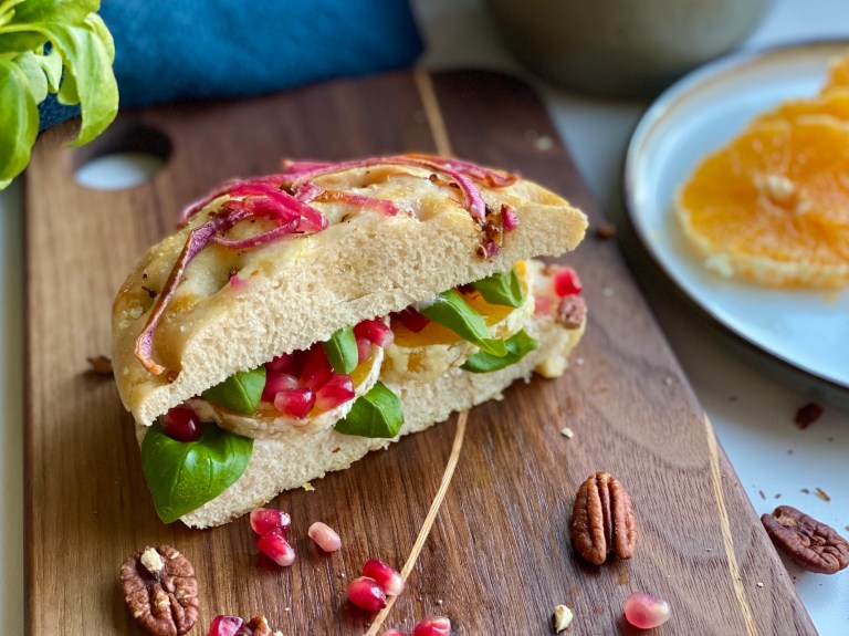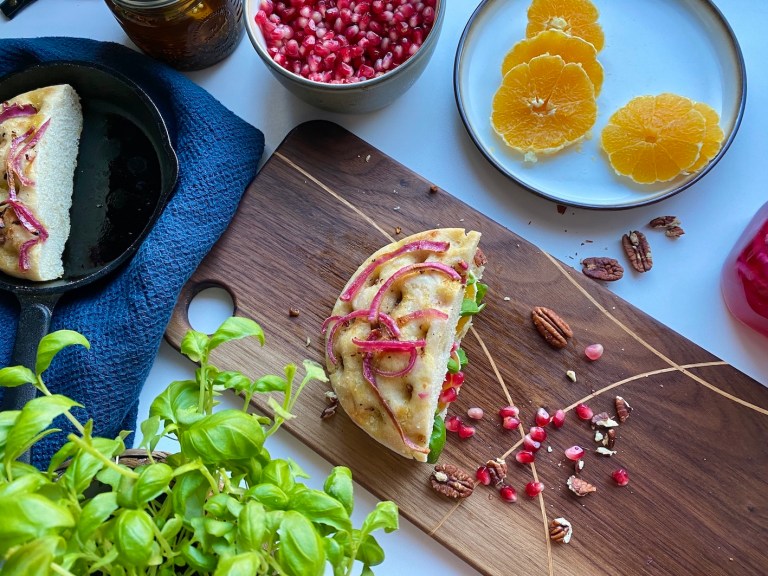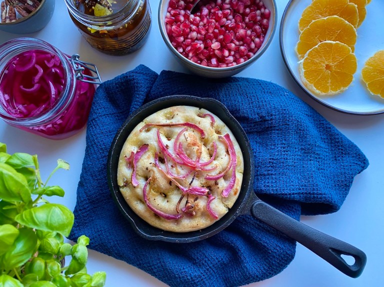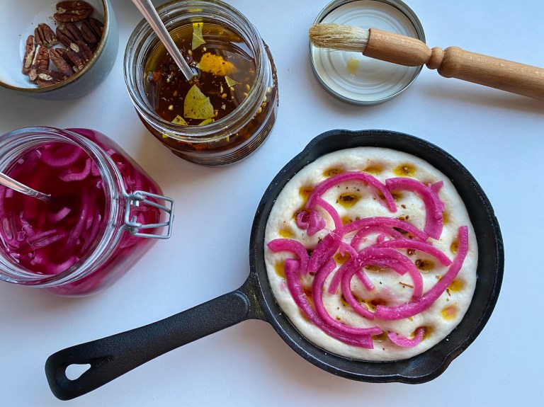 Oppskrift på focaccia har du her. Og syltet rødløk her.