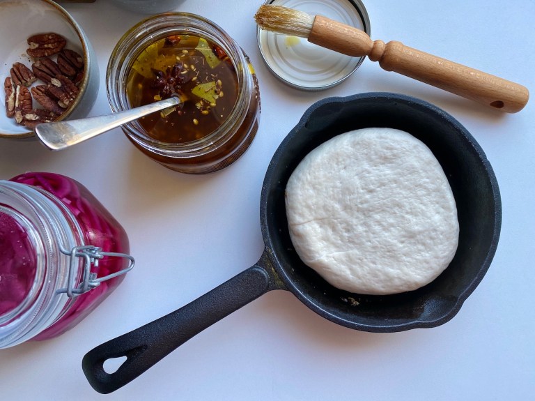 Denne gangen hadde jeg chiliolje og syltet rødløk oppå focacciadeigen før