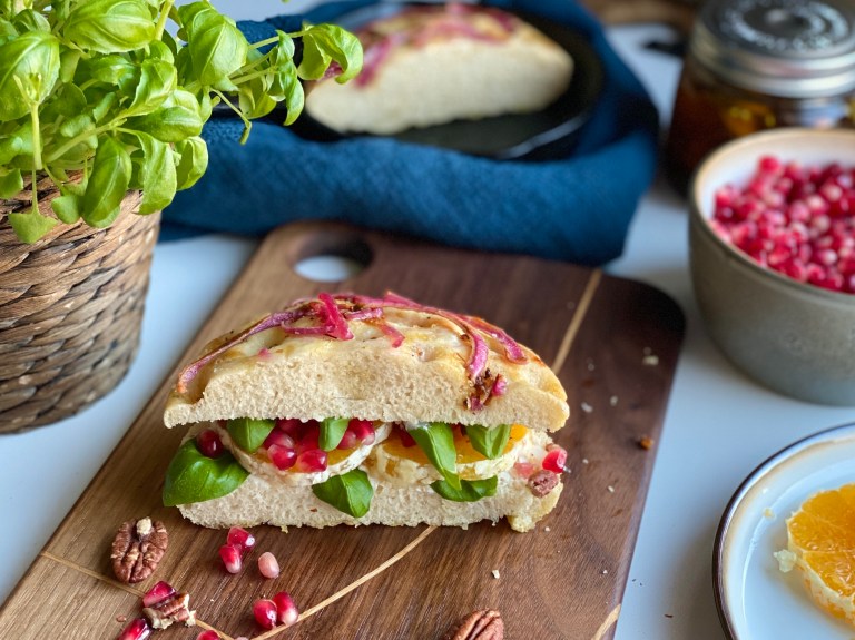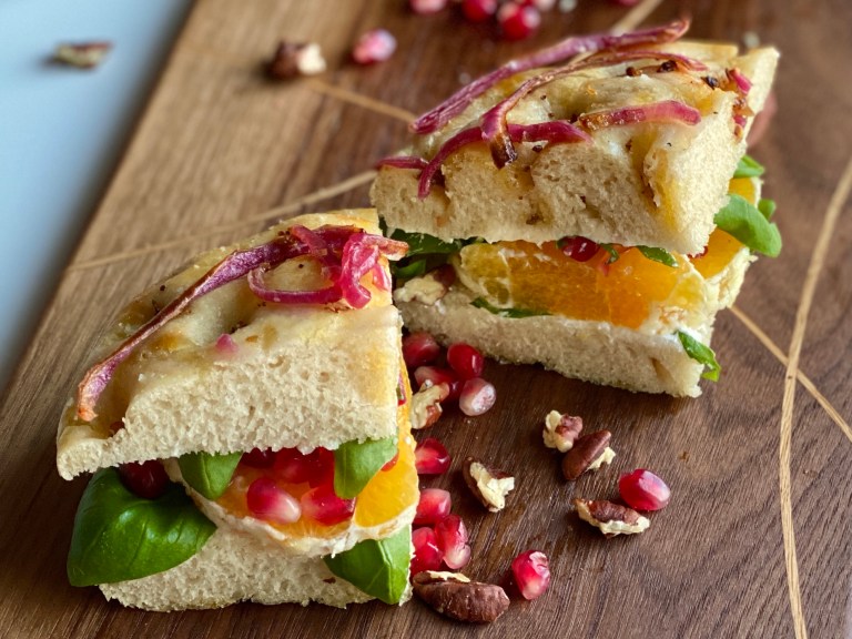 Skjær focaccia i 2 vannrett så du får en bunn og en topp.