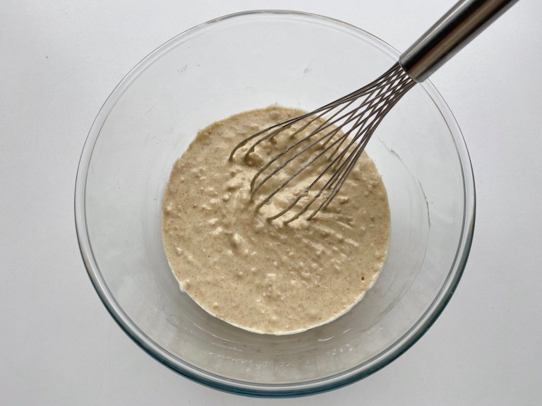 Pisk eggene med yoghurt til det blir jevnt og rør inn avkjølt smeltet smør.