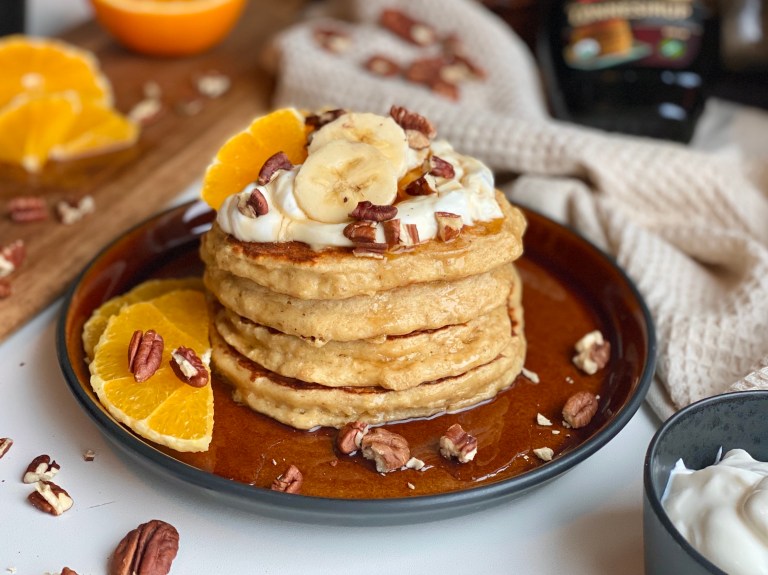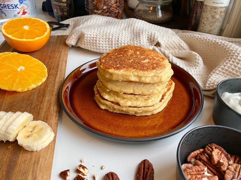 Jeg serverer med gresk yoghurt, ristede pekannøtter, lønnesirup, banan og appelsin!