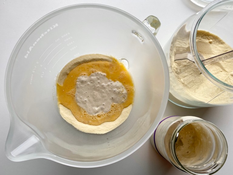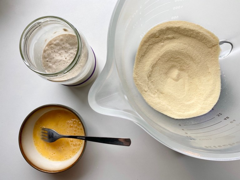 midten av melet og hell i eggene. Tilsett surdeigsstarter.
