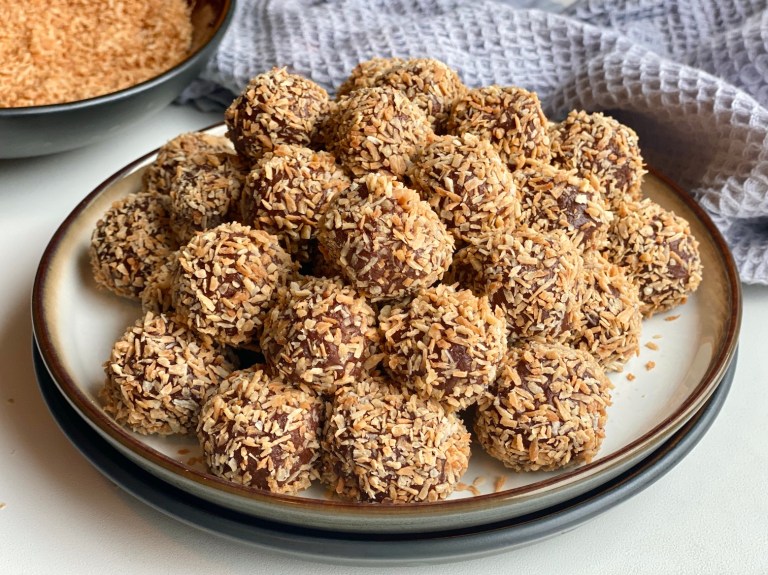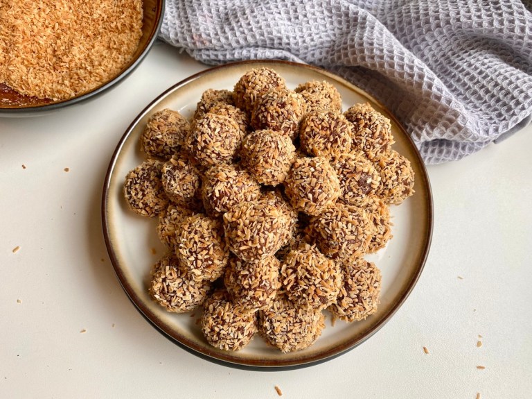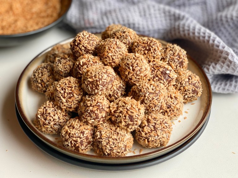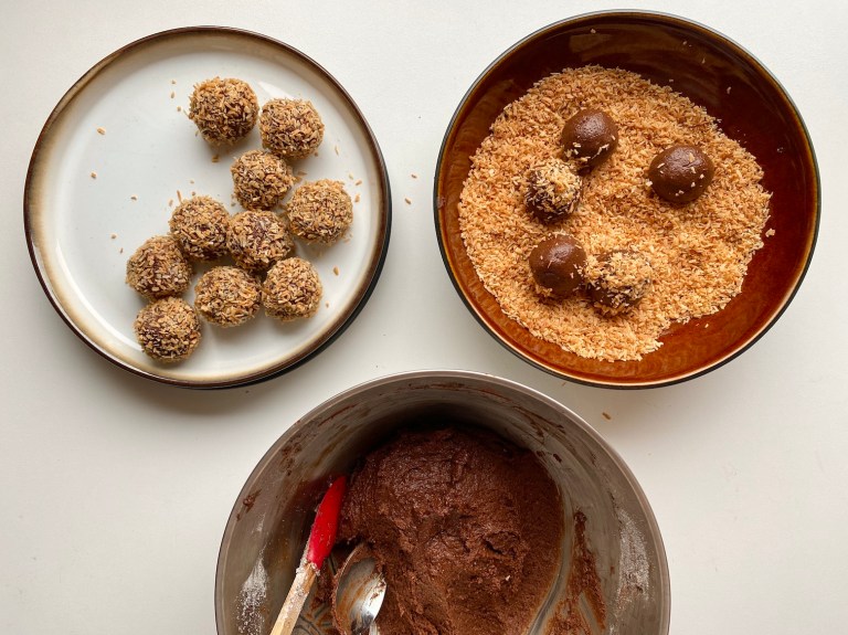 Rull kulene til slutt i ristet kokosmasse og legg de i en skål eller boks.