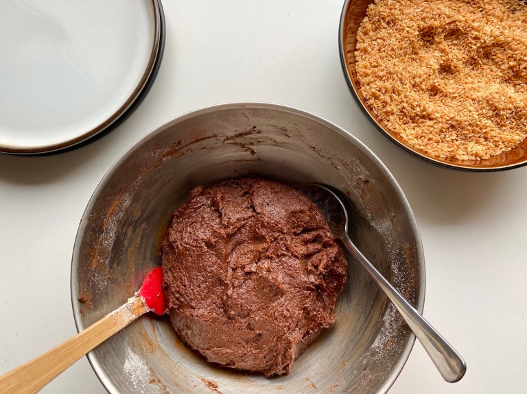 Massen blir tykk, myk og litt klissete og er da klar til å rulles til små kuler.