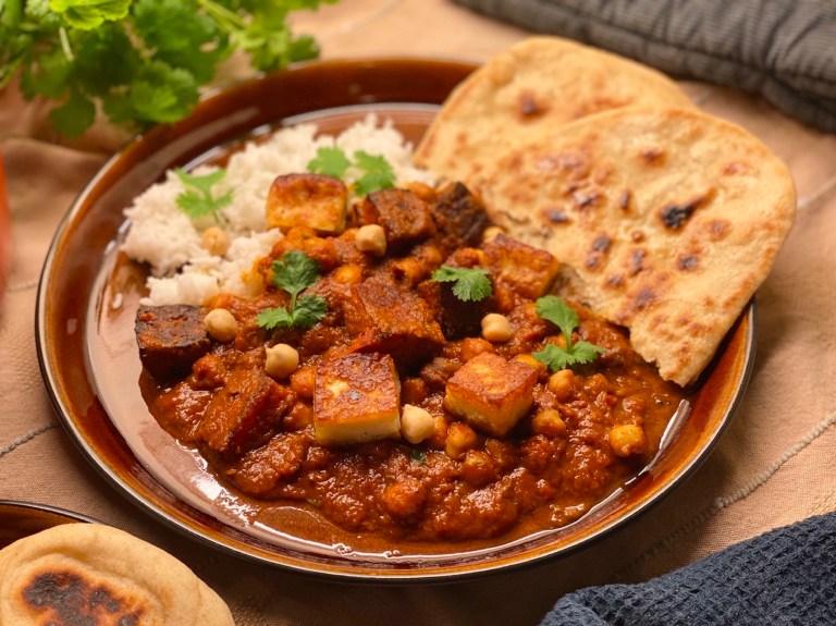 Serveres med ris, frisk grovhakket koriander og hjemmelaget naanbrød!