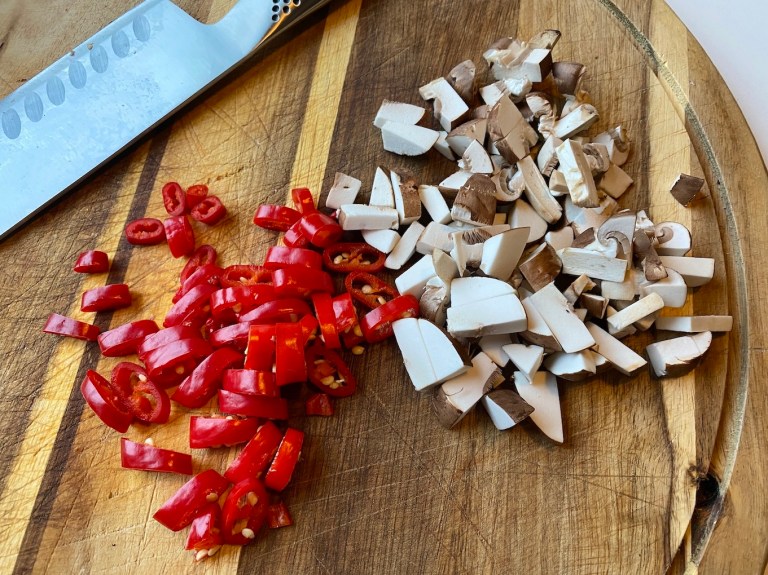 Vil du ha den mild så bruk kun 1 rød chili og fjern eventuelt frø og strenger…