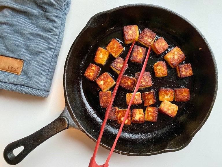 Skjær halloumi i terninger og stek terningene i en stekepanne på høy varme med