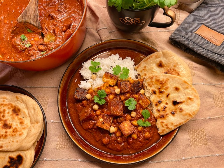 Serveres med ris, frisk grovhakket koriander og hjemmelaget naanbrød!