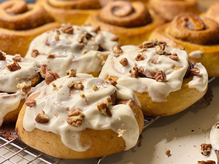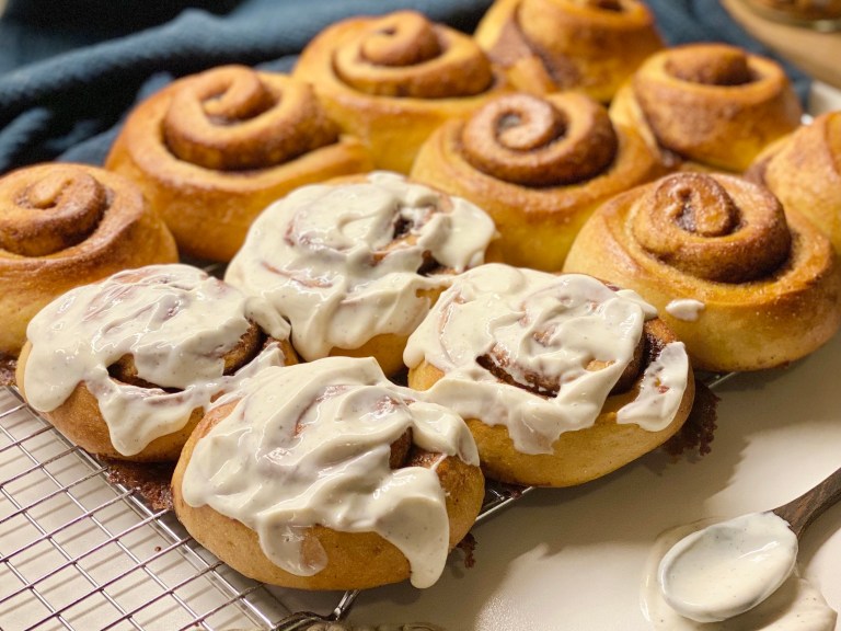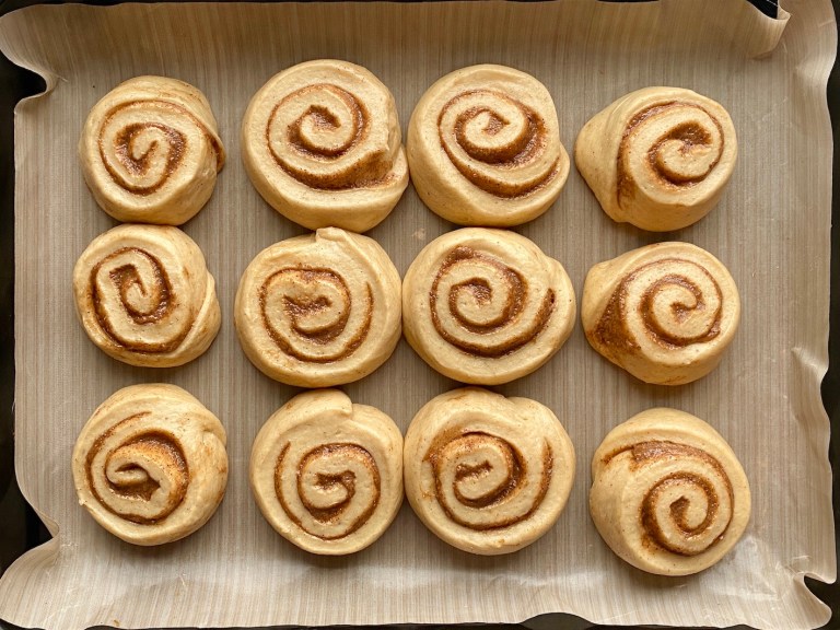 Kanelboller eller kanelsnurrer med kanel, vanilje og romfyll.