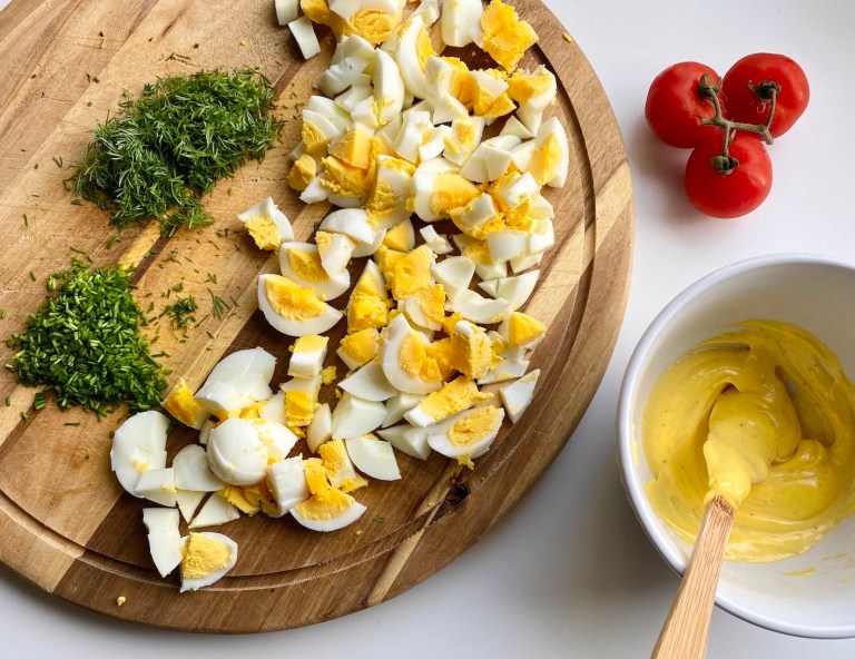 Grovhakk kalde og hardkokte egg og vend det inn i majonesblandingen.
