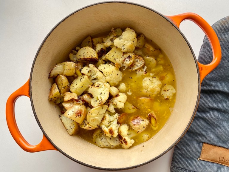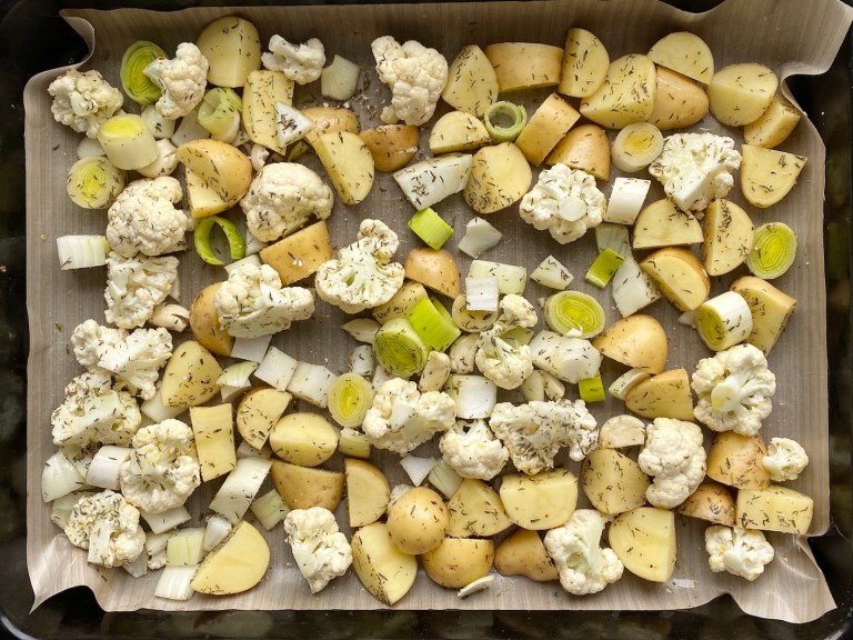 Kutt blomkålen i mindre hoder, del potetene i 6, grovhakk løk, skjær purre i 1 cm ringer