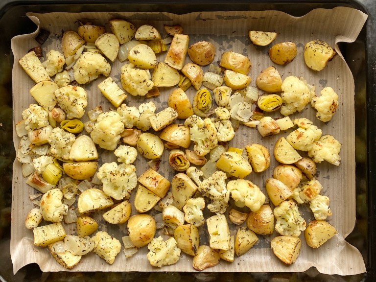 Ta formen ut av ovnen og legg til side litt av grønnsakene til senere.