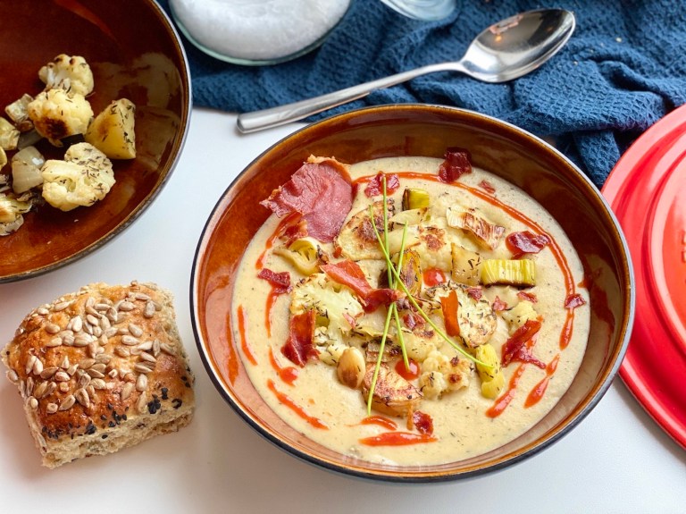 oppi suppen og toppes med sprøstekt parmaskinke.