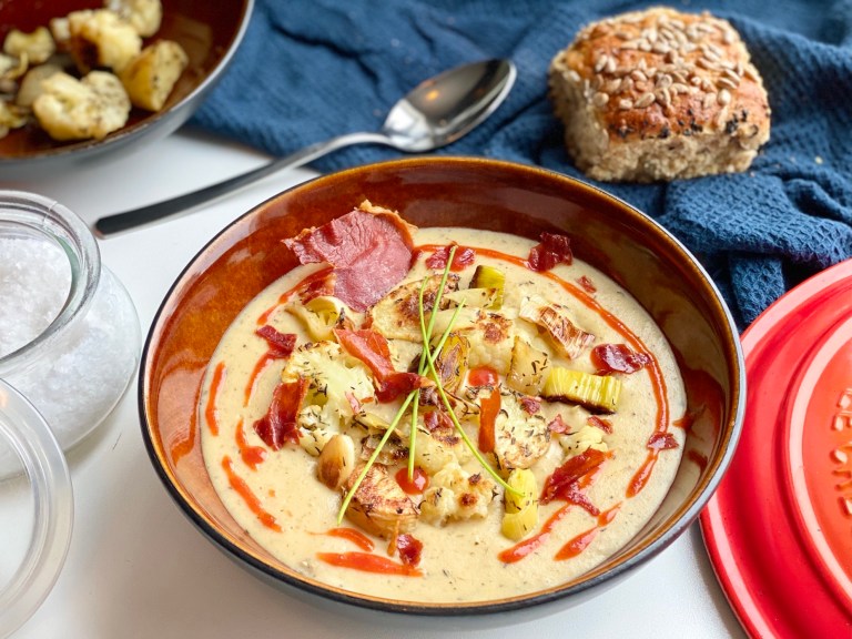 Alle grønnsakene er bakt i ovn og det gir en skikkelig god smak på suppen 🙂