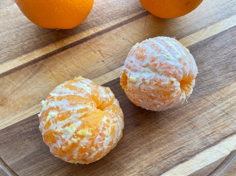 Skrell appelsinene, ta evt. ut stener og mest mulig av det hvite som er bittert.