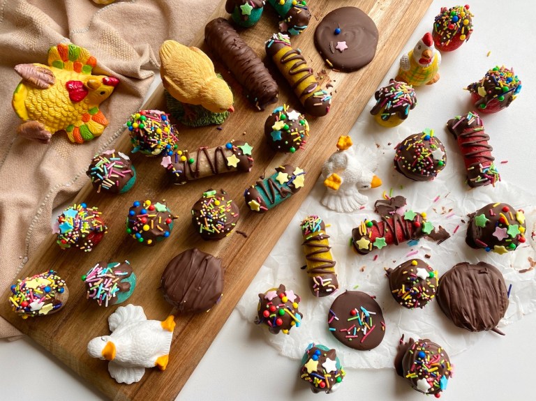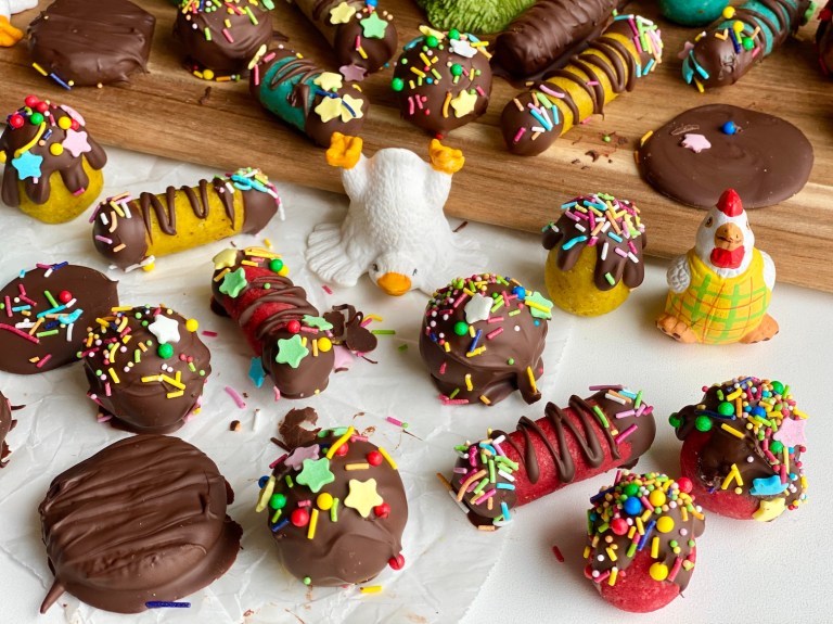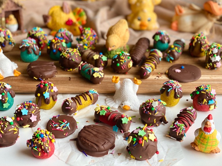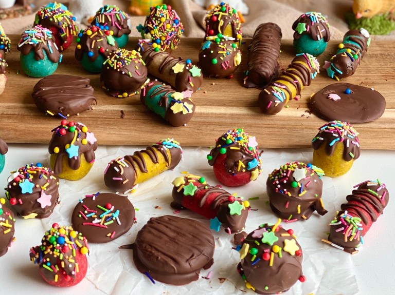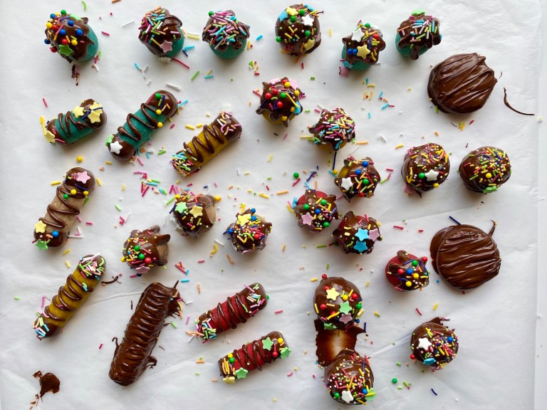 Strø over forskjellig kakestrø før sjokoladen tørker helt.