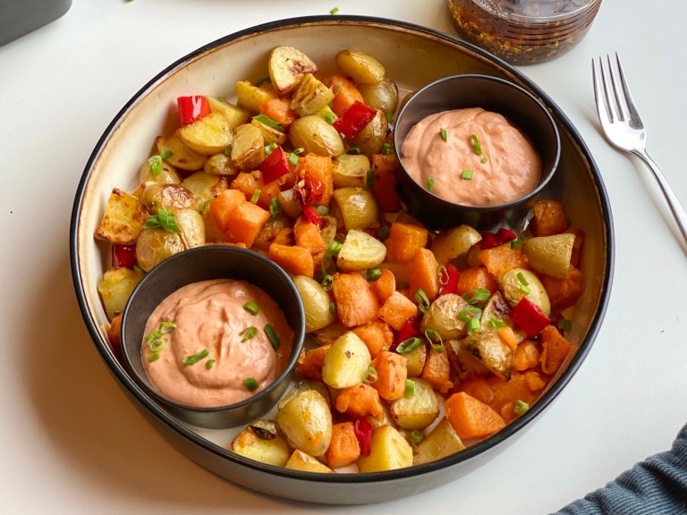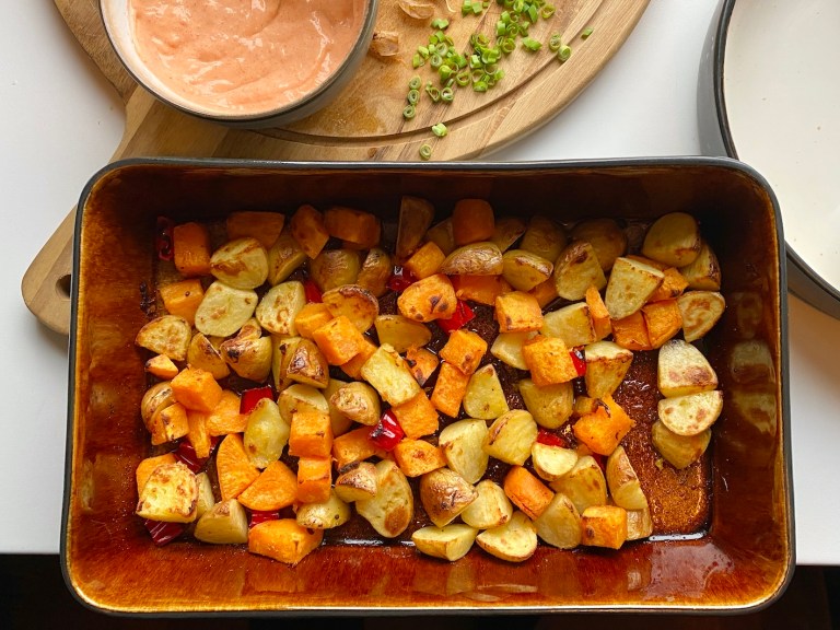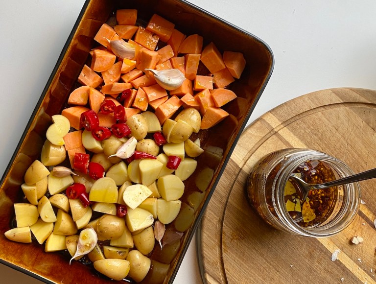 Poteter, søtpoteter, chili og hvitløk i skjønn forening 🙂