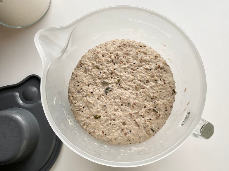 Bland alt melet, salt, frø og kjerner og tilsett i bakebollen sammen med oljen.