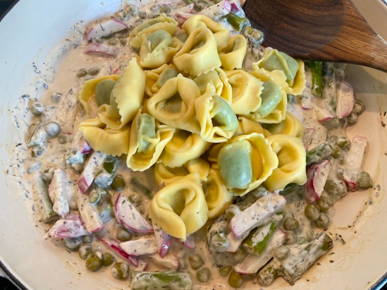 Ha i tortelloni rett fra kokevannet og vend det sammen med sausen før du har