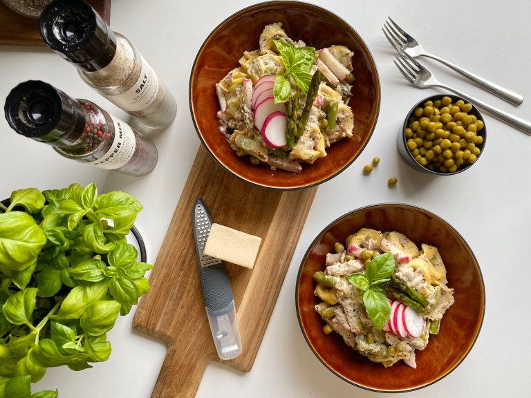 Ha det over på 2 tallerkener og pynt med reddikskiver og frisk basilikum.