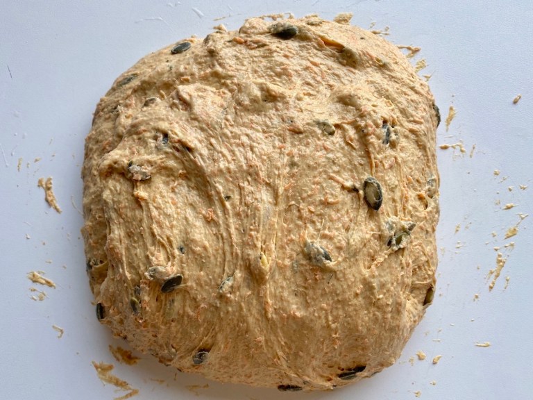 Rør sammen surdeigsstarter og vann og tilsett alt melet og gulrøttene.