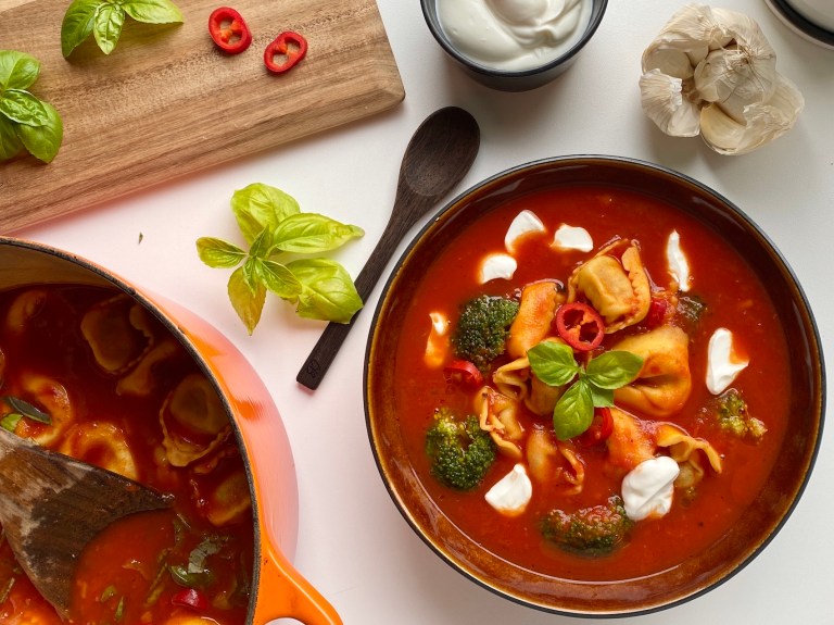 Denne tomatsuppen er sterk, fyldig og mettende med pasta og brokkoli.