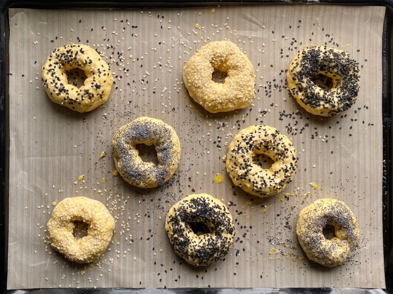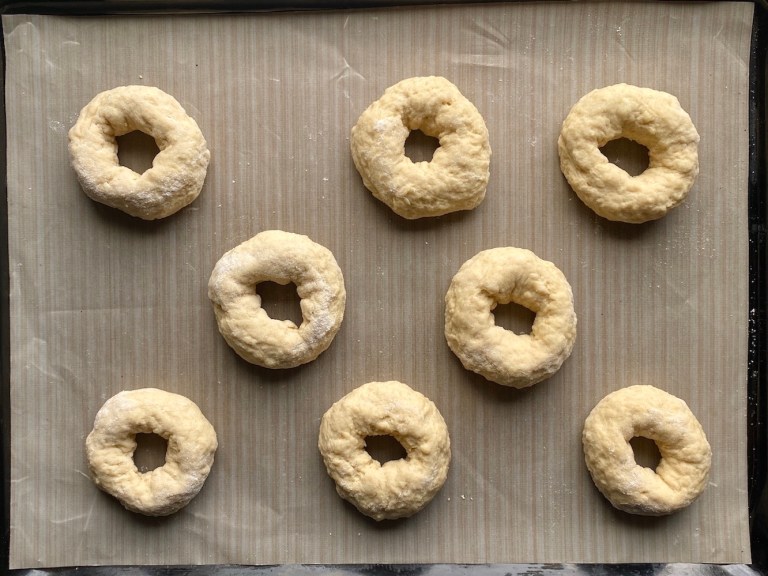 og del deigen i 8 emner. Disse blir små bagels men del gjerne deigen i 4-6 for større.