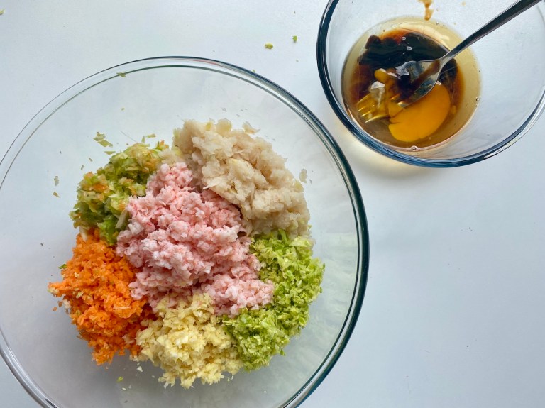 Ha alt i bollen. Pisk egget sammen med soyasaus, sesamolje og østerssaus.
