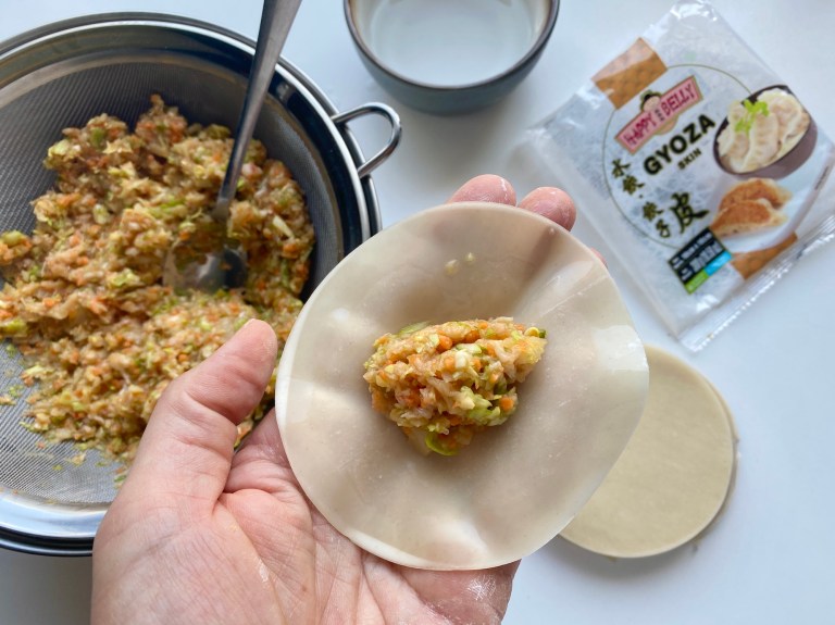 Ta ett gyoza ark i hånden, legg på 1 ts med masse på midten, smør vann