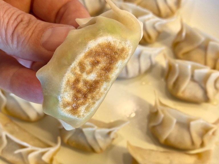 Legg 14-15 gyozaer i pannen og la de steke til gylden brune under, 3-4 minutter.