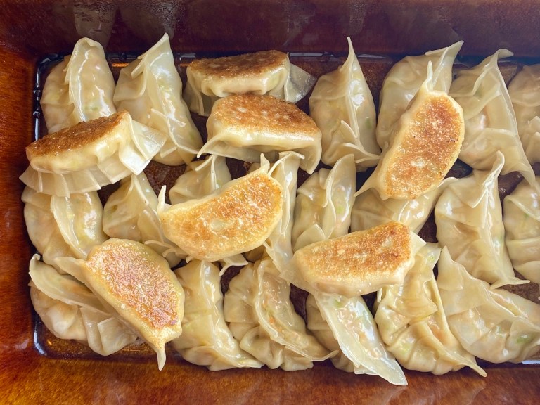 Legg de ferdig stekte gyozaene på et fat og dekk til med