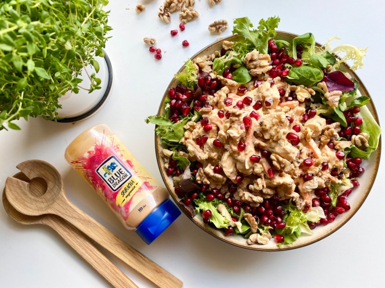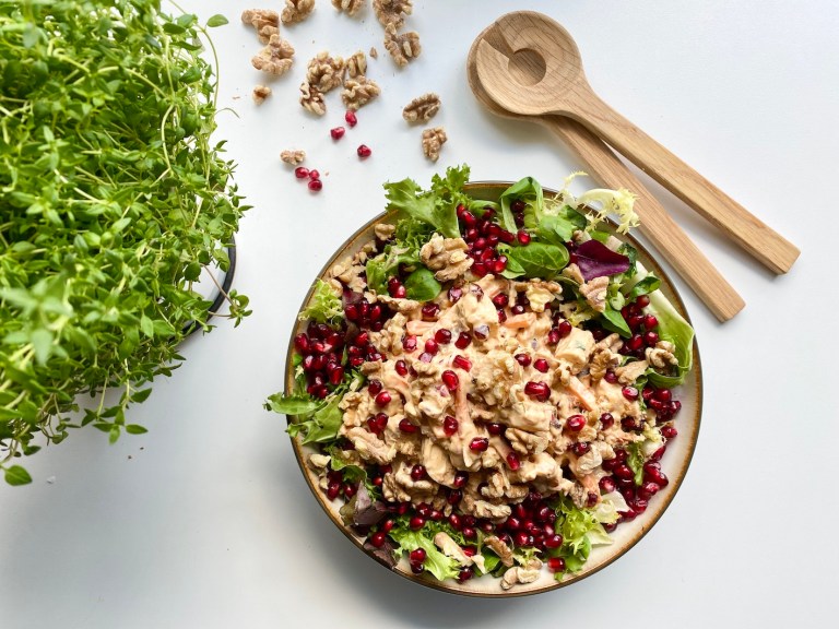 Ha salatmiksen i en salatbolle, legg kyllingsalaten over og strø over