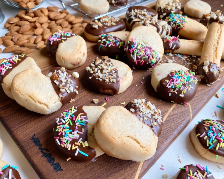 Disse er dyppet i smeltet sjokolade og pyntet med kakestrø og hakkede mandler.