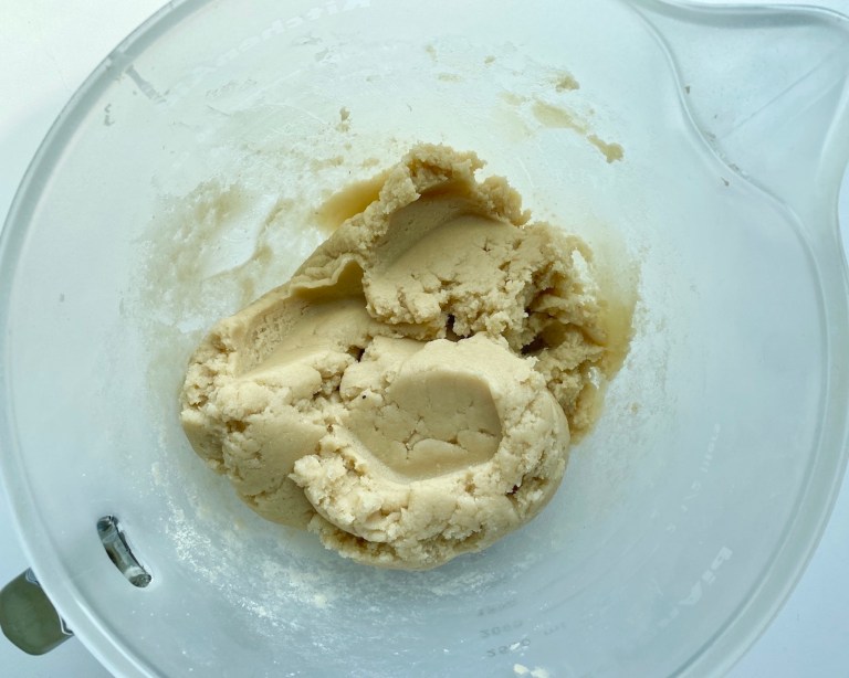 I en kjøkkenmaskin med eltekrok kjører du sammen mandelmel og melis.