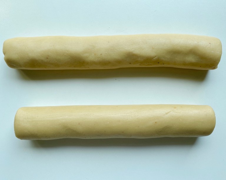 Del deigen i 2 og form de til to lange pølser, ca. 4-5 cm i diameter.