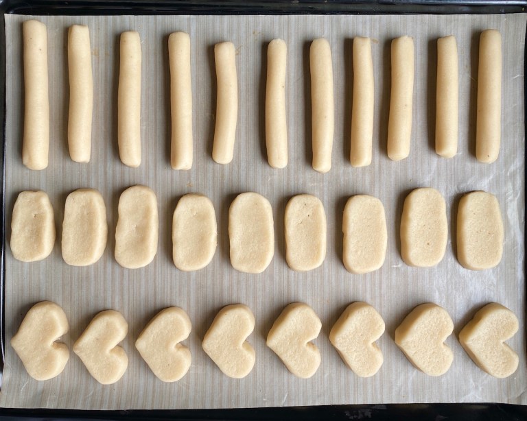 Form de til kransekakestenger, ca. 10 cm lange, og andre figurer som du ønsker.