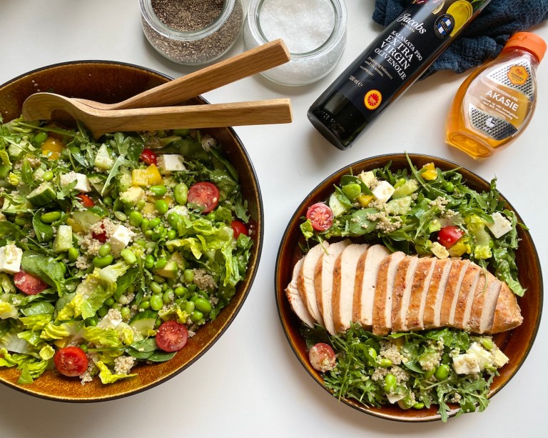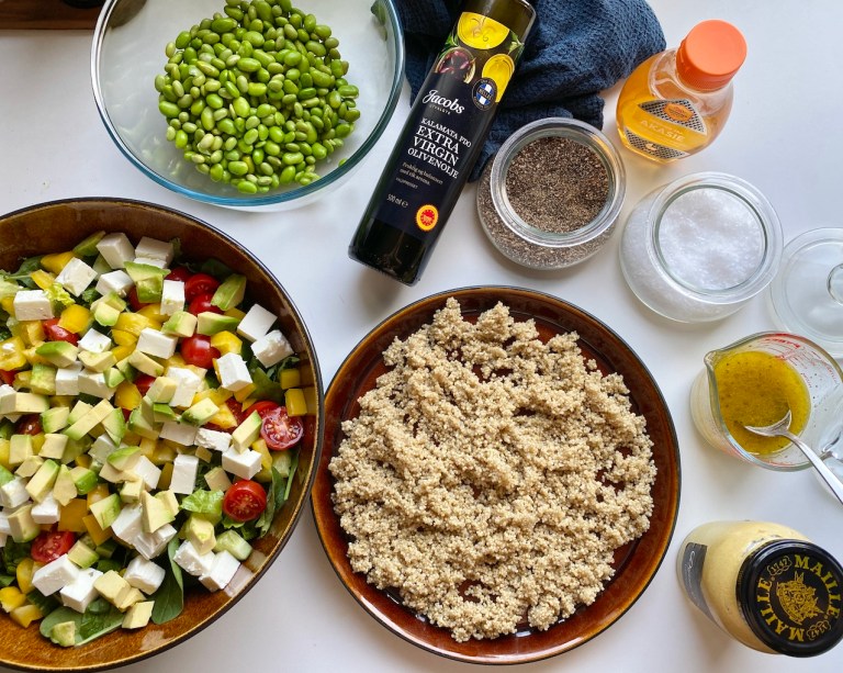 avkjølt quinoa og edamamebønner. Bland alt sammen og til slutt