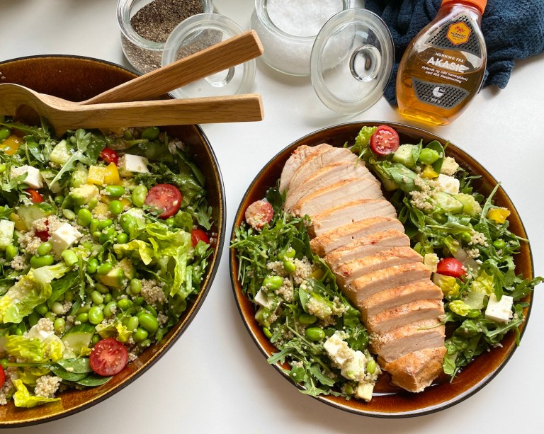 Rør sammen ingrediensene til dressingen og smak til med salt og pepper.