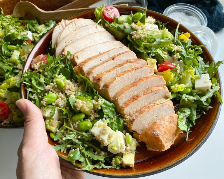 avkjølt quinoa og edamamebønner. Bland alt sammen og til slutt