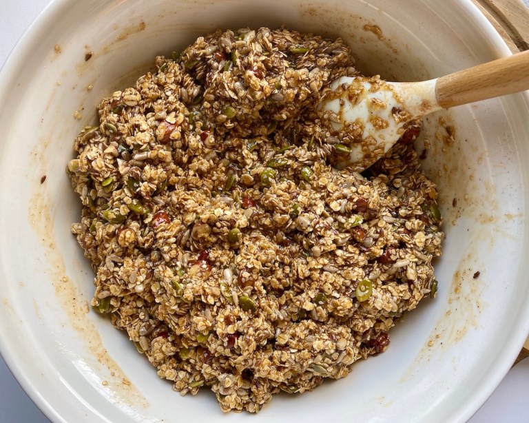 Nå er den litt klissete pga appelsinsirupen så da er det bare å ha granolaen
