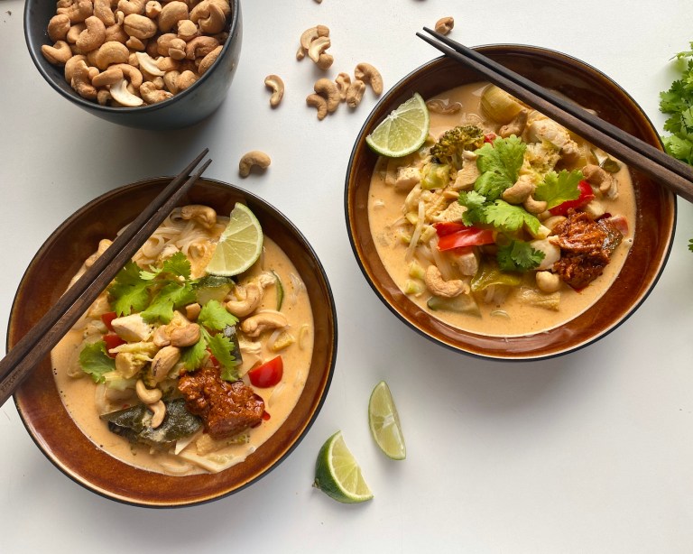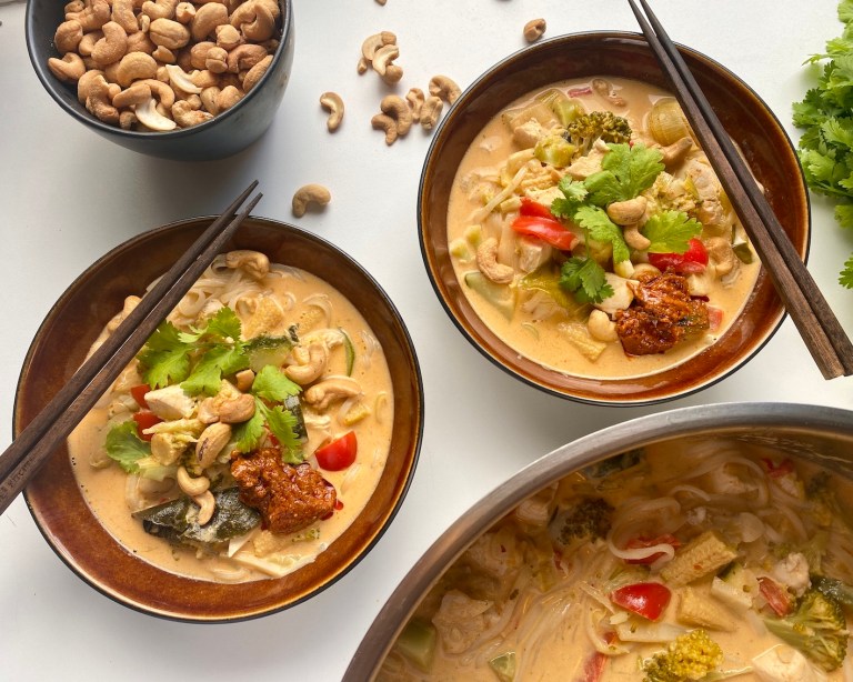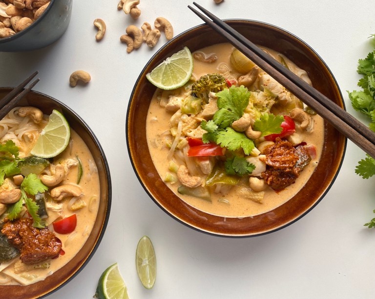 Du justerer styrken på suppen med mer eller mindre rød chili og red curry paste.