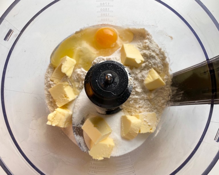 Ha i smøret og gni til alt er blandet og deigen blir småklumpete. Sett til side.