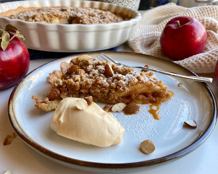 Serveres med karamellmascarponekrem (eller vaniljeis), ristede mandler og