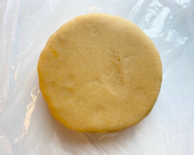 den sammen til en rund og litt flat deig. Pakk den inn i plastfolie og la den ligge i