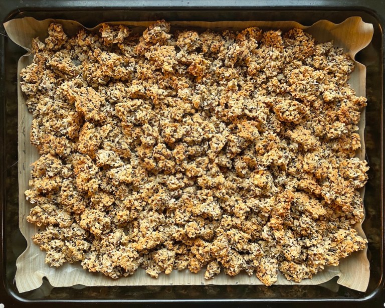 Bre det løst utover på et stekebrett med bakepapir og dra massen jevnt utover.