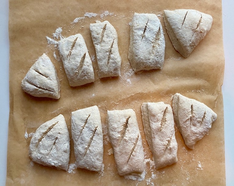 Strø over litt hvetemel og glatt det ut. Kutt deigen opp i 10 emner og legg de litt