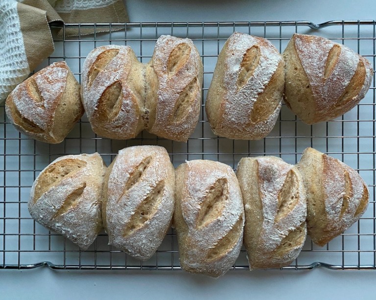 Min brukte 6 timer denne gangen. Hydrasjonen på rundstykkene er 65%.