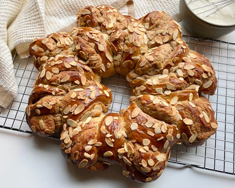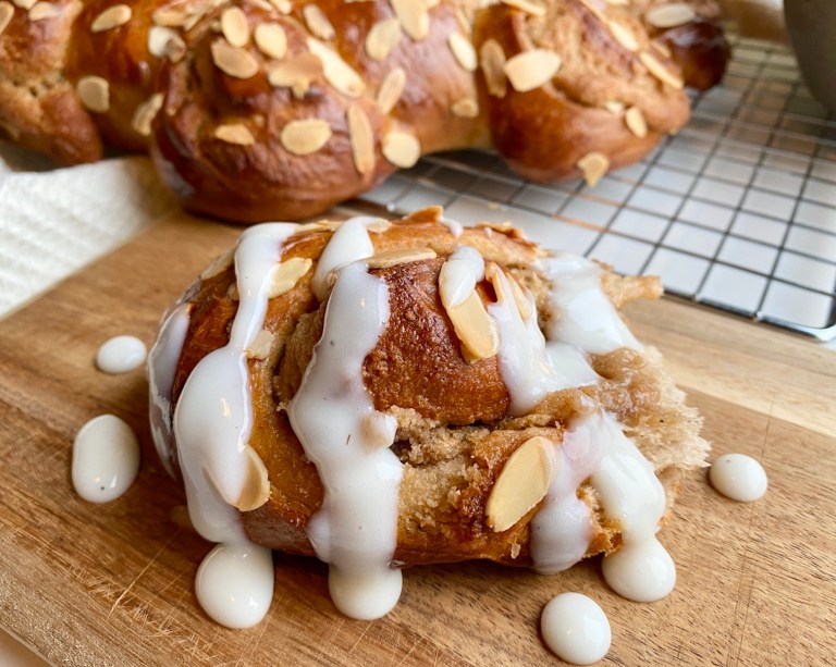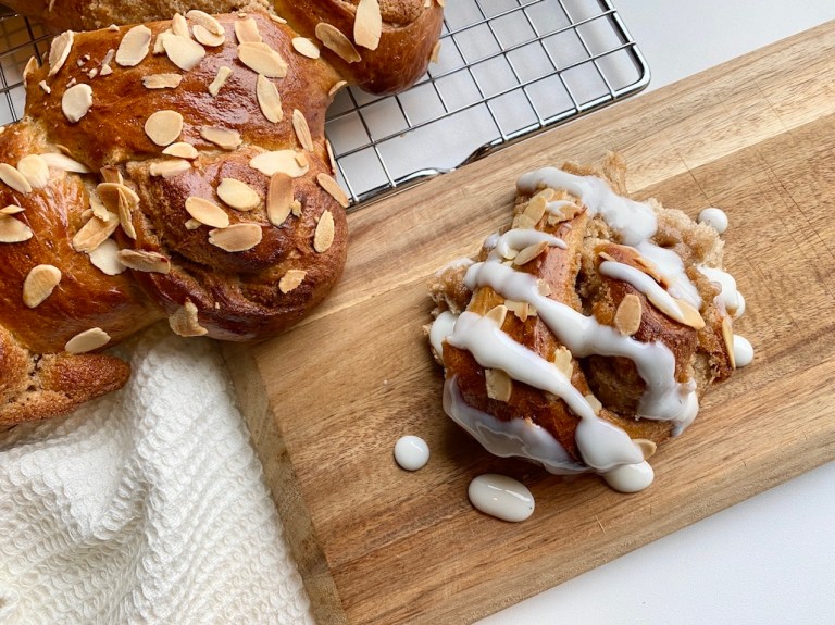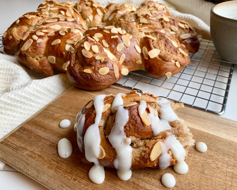 Den er fylt med hjemmelaget mandelfyll og toppet med vaniljeyoghurtglasur.